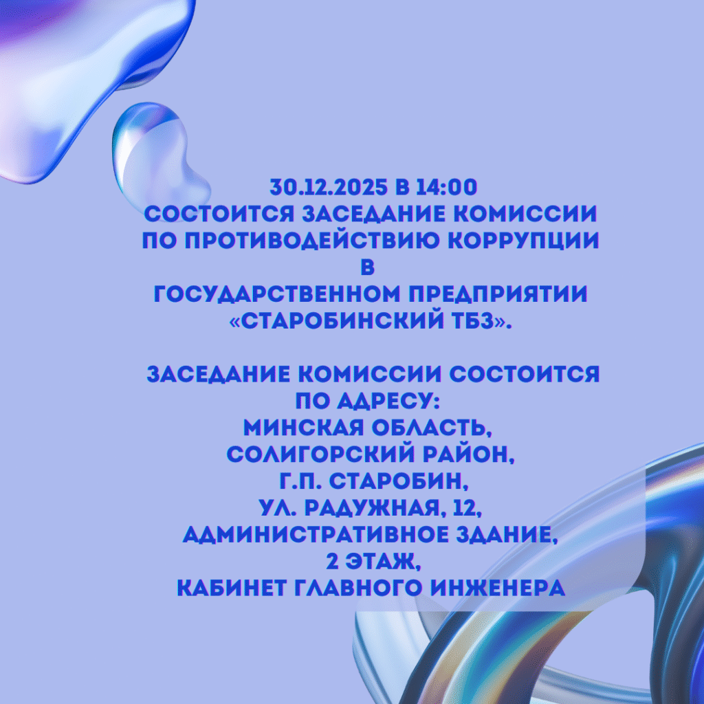 30.12.2025 в 14:00 заседание комиссии по противодействию коррупции в государственном предприятии «Старобинский ТБЗ»